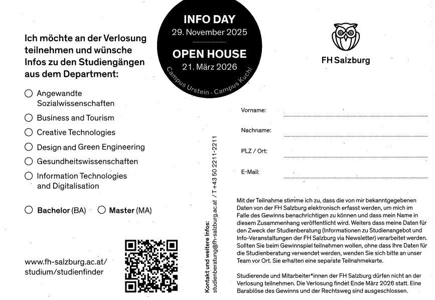 Das MilKdo S / Ref Truppenbetreuung und Familienbetreuung informiert darüber, dass am 29. November der Info Day der FH Salzburg an den Standorten Campus Urstein und Campus Kuchl von 0900 bis 1400 Uhr s ...