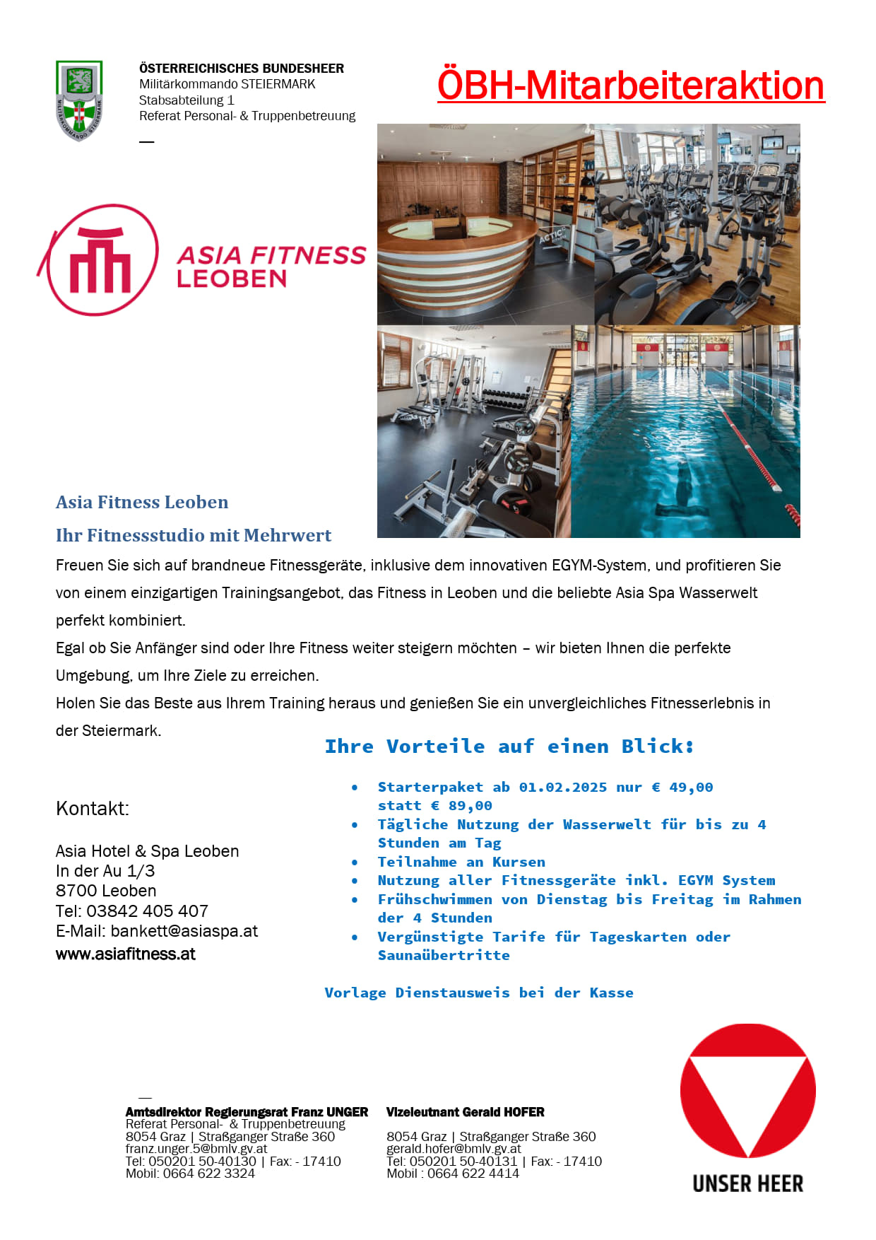Das Ref TrBe&FamBe informiert mit den Beilagen über eine Ermäßigungsaktionvon -15 % auf YOGA, FITNESS, PERSONAL TRAINING und SELBSTVERTEIDIGUNGSKURSE für alle Angehörigen des ÖBH (GWD, Soldaten, Zi ...