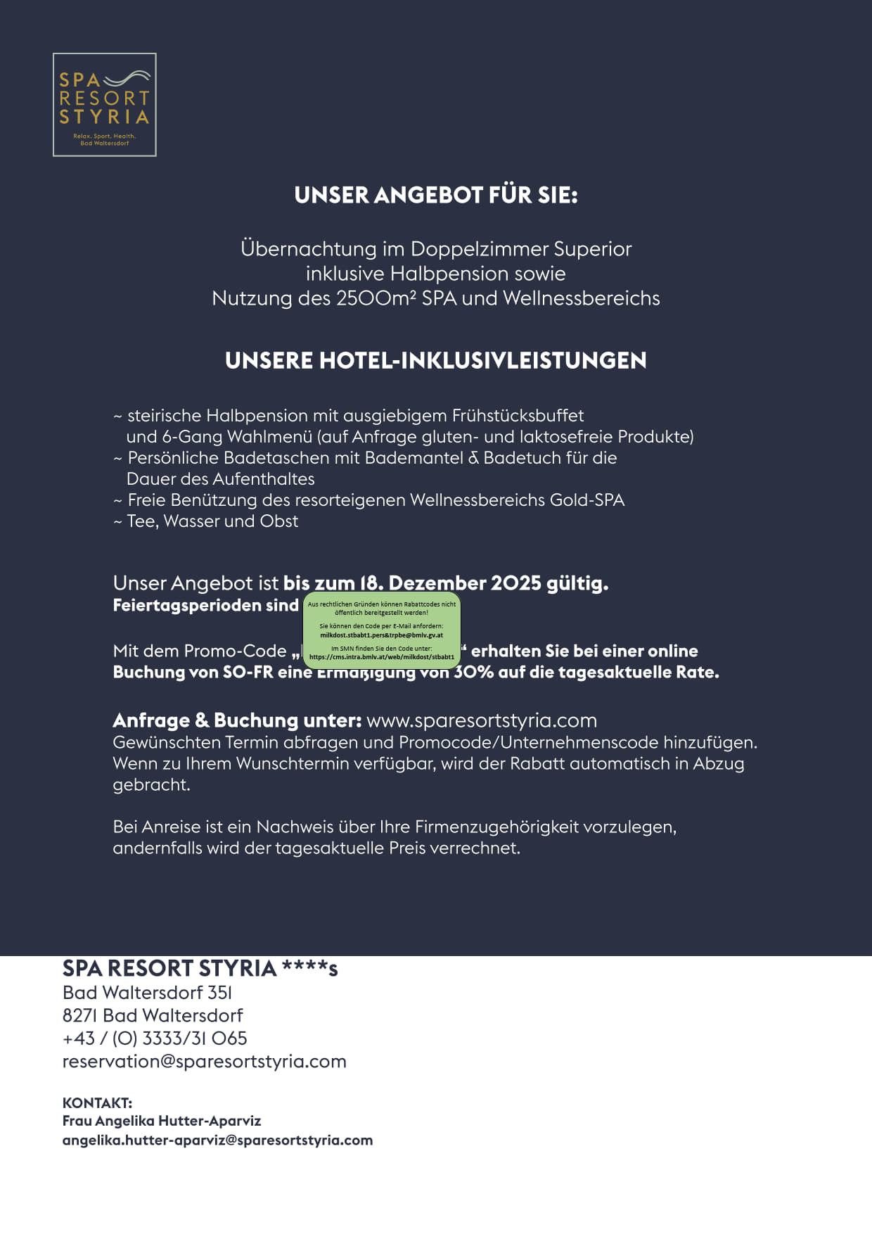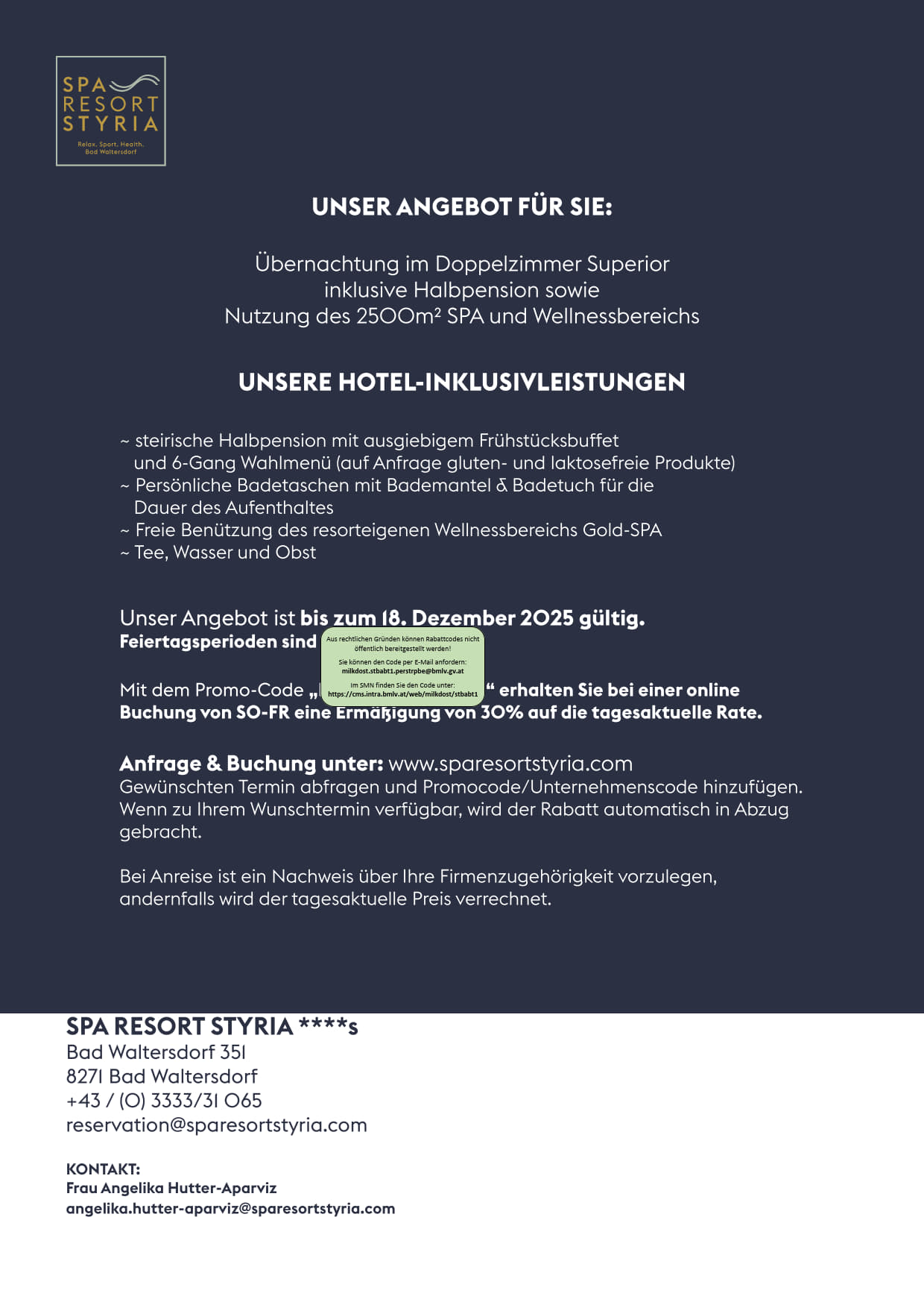 UND SO FUNKTIONIERT´s…..Bei der Buchung über den Link https://onepagebooking.com/miraverde-eurothermenresort ist der Firmenname - ÖBH - und das Kennwort - Firmenvorteil - anzugeben.Weitere Informatione ...