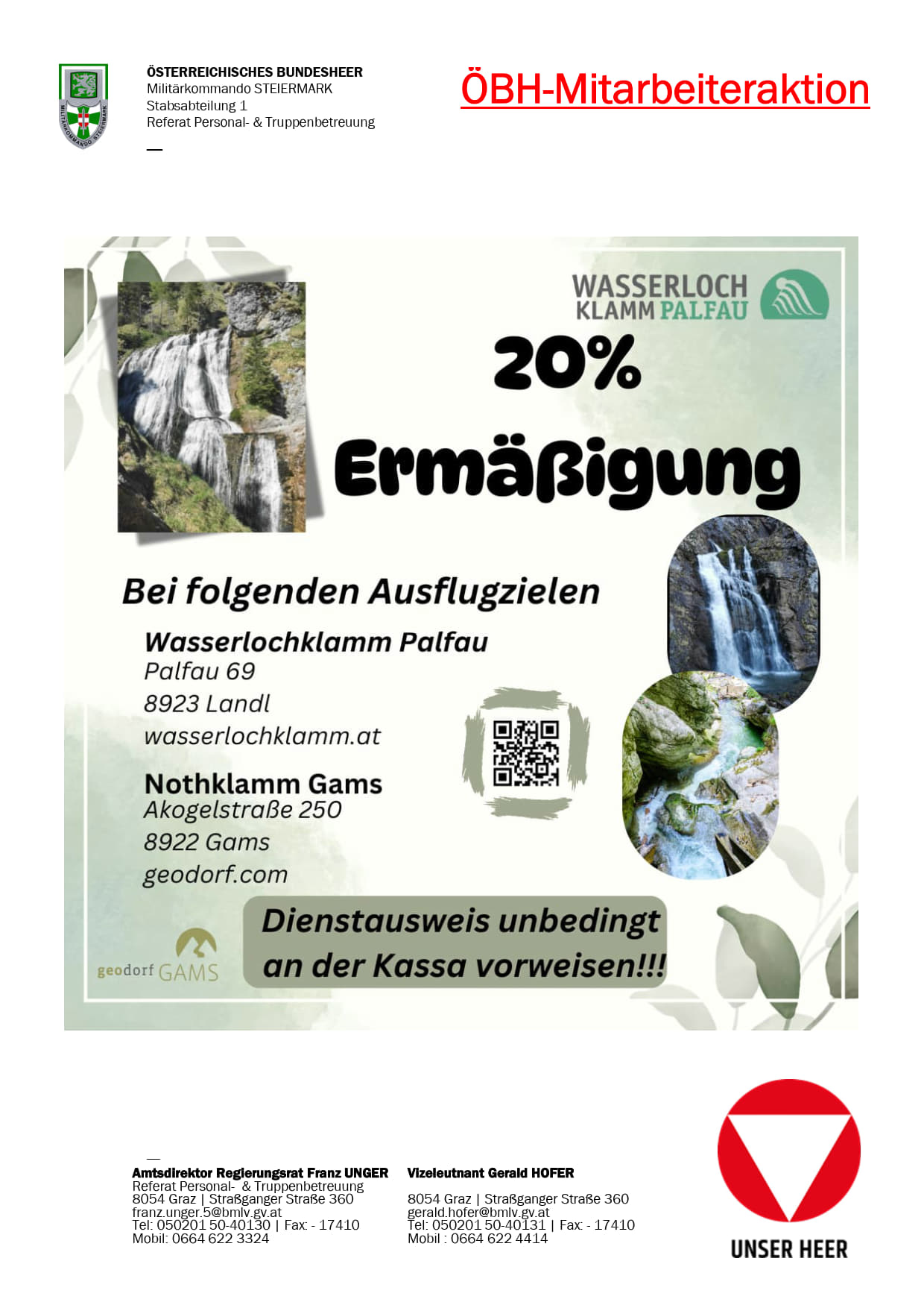 Das Ref TrBe&FamBe informiert über eine Ermäßigungsaktion von -10 % für alle Angehörigen des ÖBH (GWD, Soldaten, Zivilbedienstete und Wehrpflichtige der Miliz) nach Vorweis eines gültigen Dienstaus ...