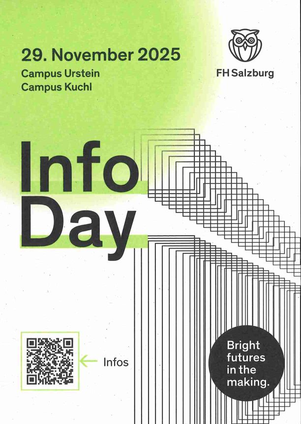 Das MilKdo S / Ref Truppenbetreuung und Familienbetreuung informiert darüber, dass am 29. November der Info Day der FH Salzburg an den Standorten Campus Urstein und Campus Kuchl von 0900 bis 1400 Uhr stattfindet. Unter dem Motto ,,Bright futures in the making“ sind alle Studieninteressierten Rekruten und Bedienstete des ÖBH herzlich eingeladen.