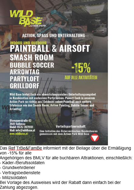 Das MilKdo S Ref. TrBe&FamBe informiert über die Neuerscheinung des Gutscheinbuches 2026 für Salzburg und Umgebung. Das Gutscheinbuch ist ab sofort im Ref TrBe Milkdo S in der SCHWARZENBERG-Kaserne ...