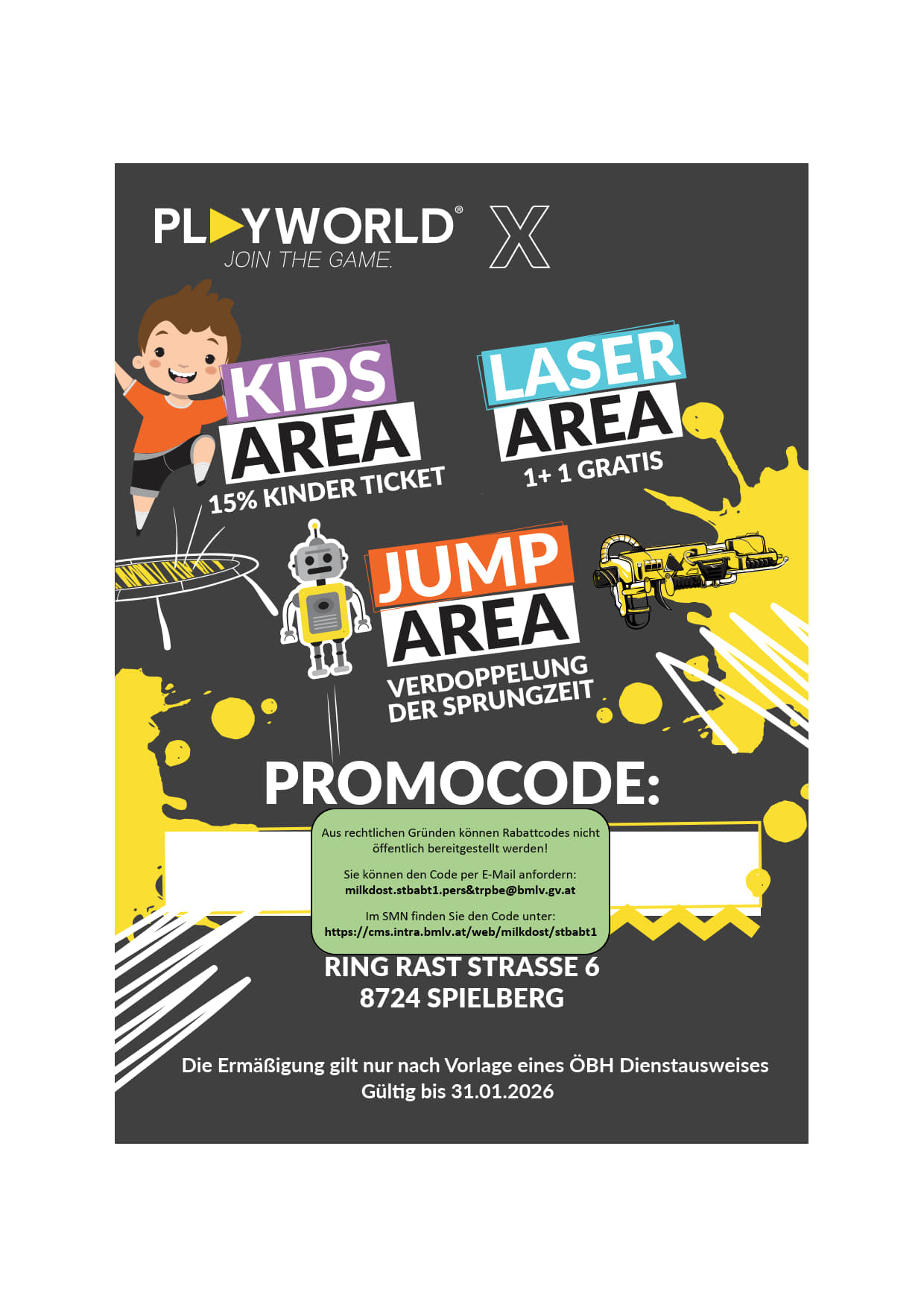 UND SO FUNKTIONIERT´s…..Nach Vorlage des Wehrdienstausweises bzw. des Dienstausweises erhaltet ihr 10% Ermäßigung auf Lastertag in der OPRIA Galaxy Adventure World Gültig:Für alle Mitarbeiter des Öste ...