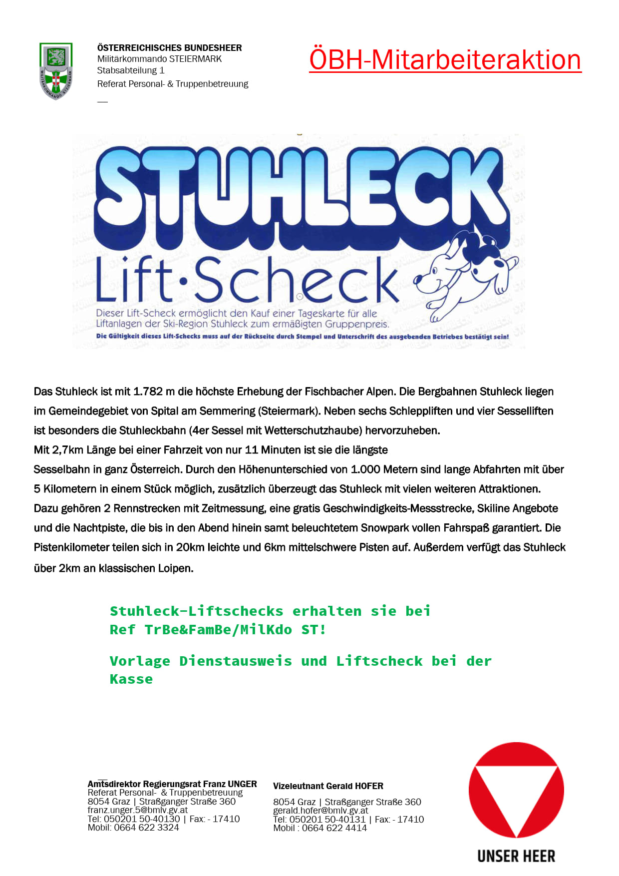 UND SO FUNKTIONIERT´s….Anmeldung ausdrucken, ausfüllen, unterschreiben und eine der folgende Email Adressen schicken : stefan.huemer.4@bmlv.gv.atDas Referat Truppen- und FamBetr/MilKdo OÖ bestätigt dan ...