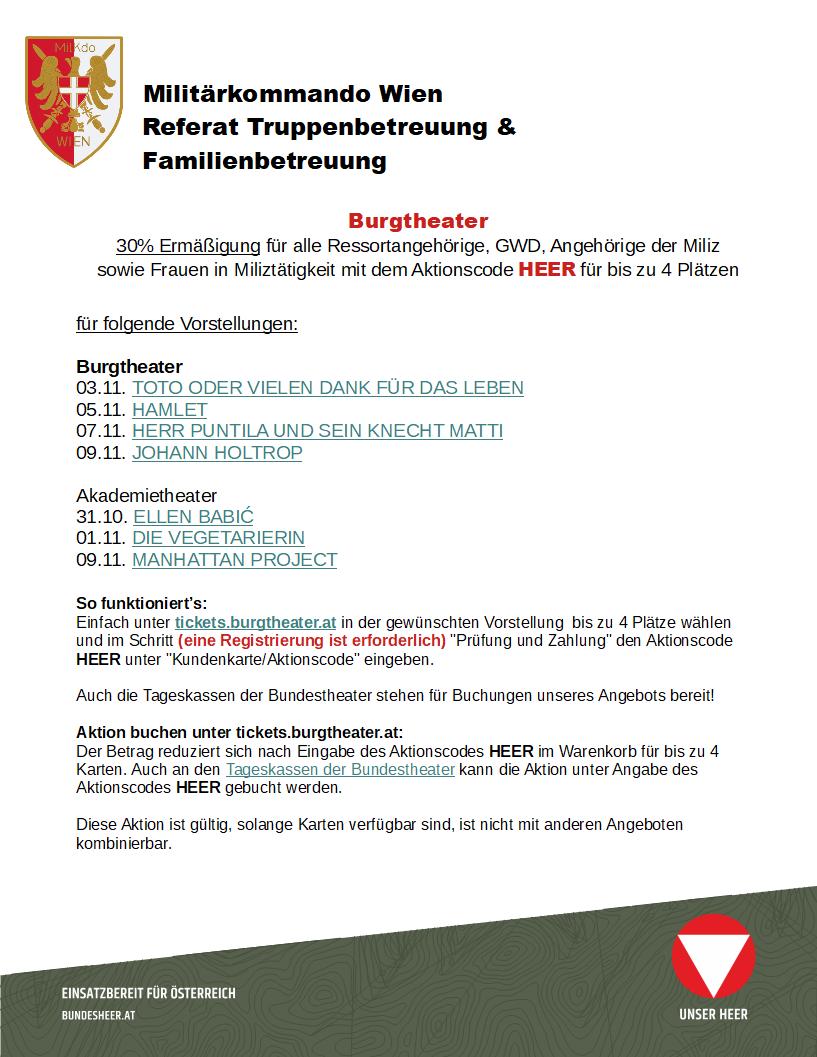 Burgtheater 30% Ermäßigung für alle Ressortangehörige, GWD, Angehörige der Miliz sowie Frauen in Miliztätigkeit mit dem Aktionscode HEER für bis zu 4 Plätzen