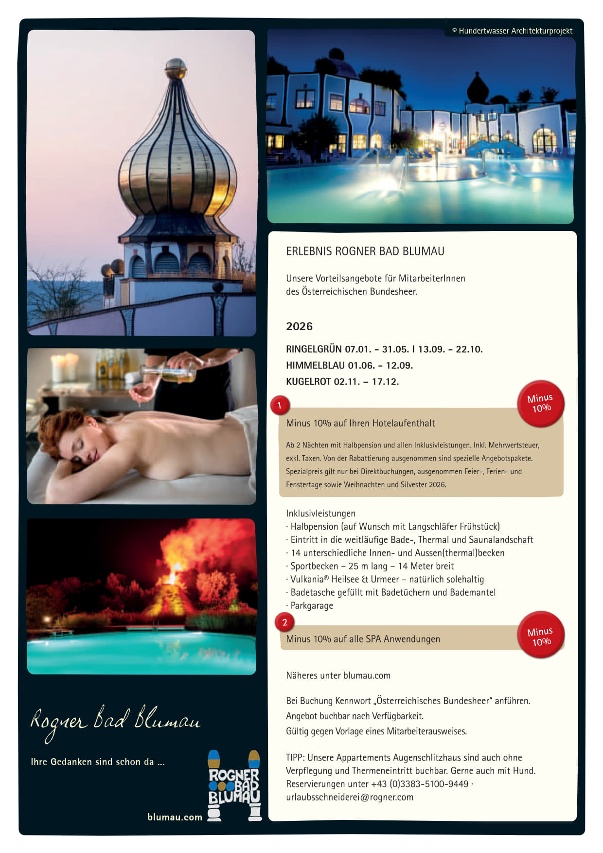 UND SO FUNKTIONIERT´s…..Bei der Buchung über den Link https://onepagebooking.com/miraverde-eurothermenresort ist der Firmenname - ÖBH - und das Kennwort - Firmenvorteil - anzugeben.Weitere Informatione ...