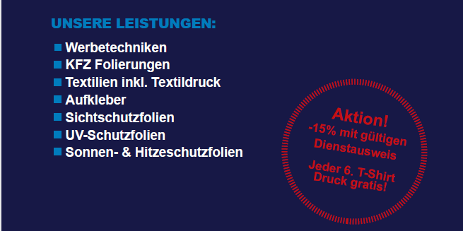 UND SO FUNKTIONIERT´s…..Nach Vorlage des Wehrdienstausweises bzw. des Dienstausweises erhaltet ihr 15% Ermäßigung auf alle Leistungen der Fa. SCHÜTZ - Beschriftungen.Gültig: Für alle Mitarbeiter des Ös ...