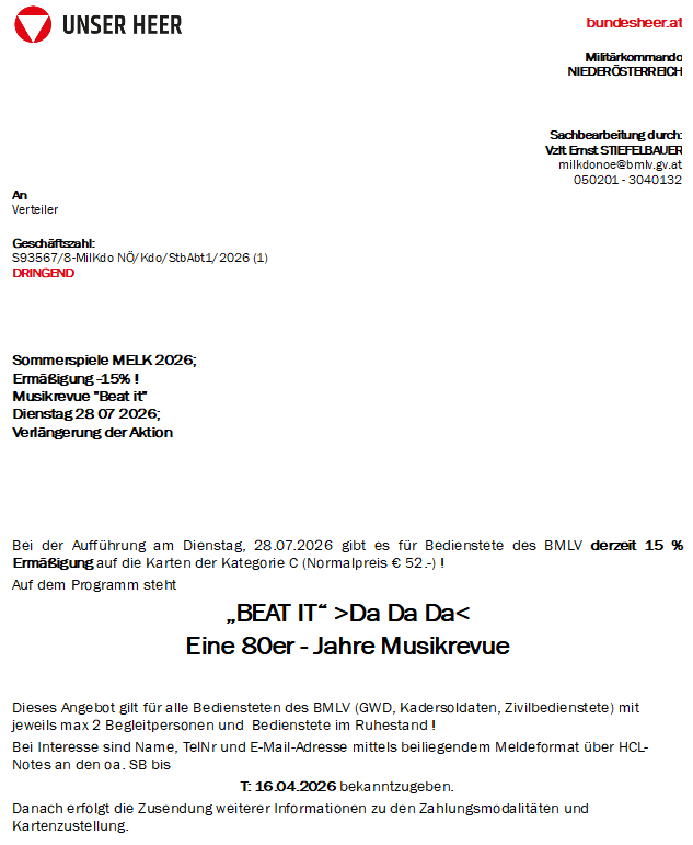 15 % Ermäßigung auf die Karten der Kategorie C!_Informationsschreiben_Meldeformat_Melk_2026_oder direkt per mail an SB Ref TrBe&FamBe_Beat_It_Melk_Sommerspiele_2026_Sitzplan