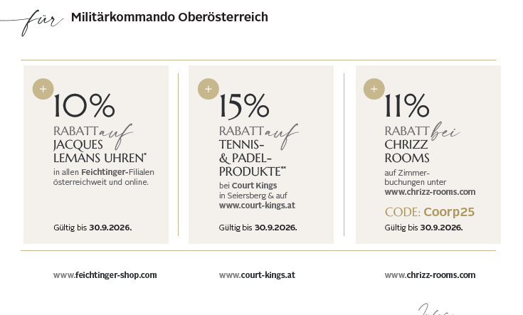 UND SO FUNKTIONIERT´s…..Nach Vorlage des Wehrdienstausweises bzw. des Dienstausweises erhaltet ihr am Standort in LINZ den Jugendtarif anstelle des NormaltarifesGültig:Für alle Mitarbeiter des Österrei ...