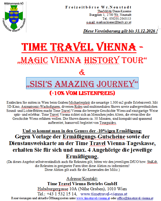Die Donaukultur KG bietet den Bediensteten des ÖBH sowie den Milizsoldaten auf folgende Veranstaltungen einen Rabatt von 20%, für Familienangehörige einen 10%igen Rabatt, für Gruppen wird ein 25%er Rab ...