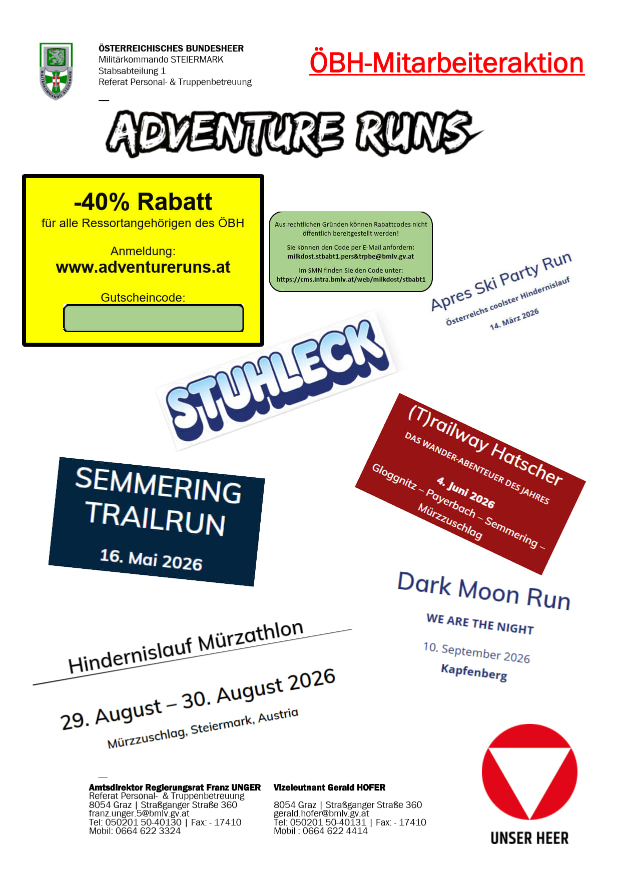 UND SO FUNKTIONIERT´s….Anmeldung ausdrucken, ausfüllen, unterschreiben und eine der folgende Email Adressen schicken : stefan.huemer.4@bmlv.gv.atDas Referat Truppen- und FamBetr/MilKdo OÖ bestätigt dan ...