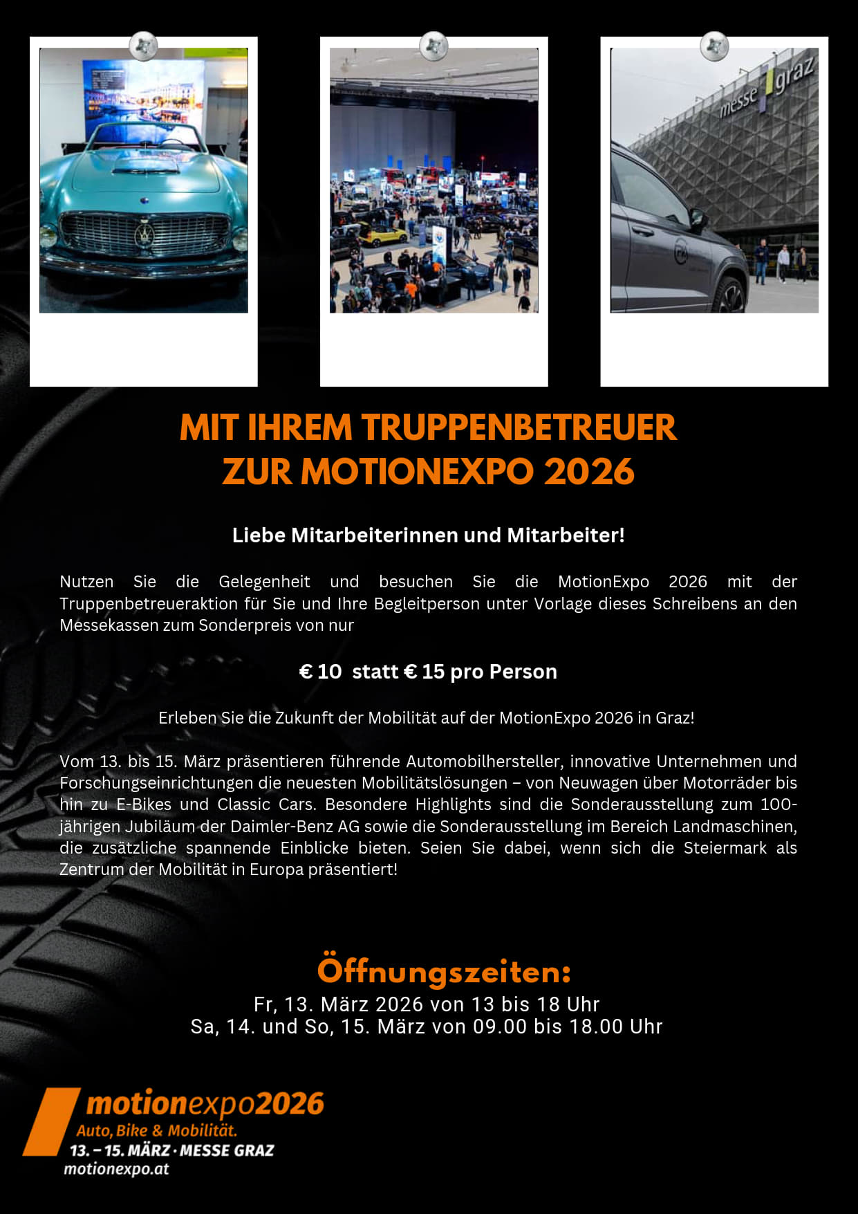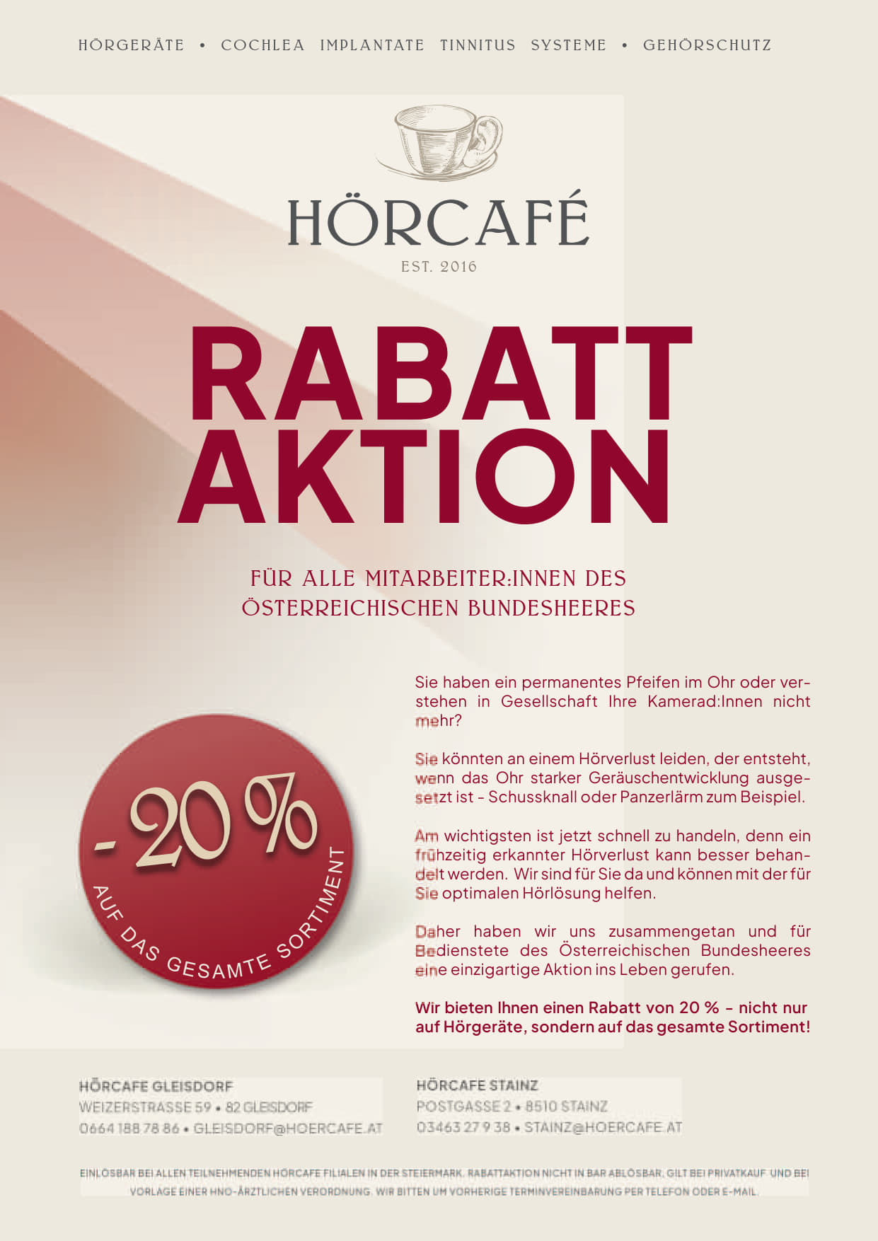 UND SO FUNKTIONIERT´s…..Nach Vorlage des Wehrdienstausweises bzw. des Dienstausweises erhaltet ihr 20% Ermäßigung auf die Arbeitszeit und 5% auf Teile Gültig:Für alle Mitarbeiter des Österreichischen B ...