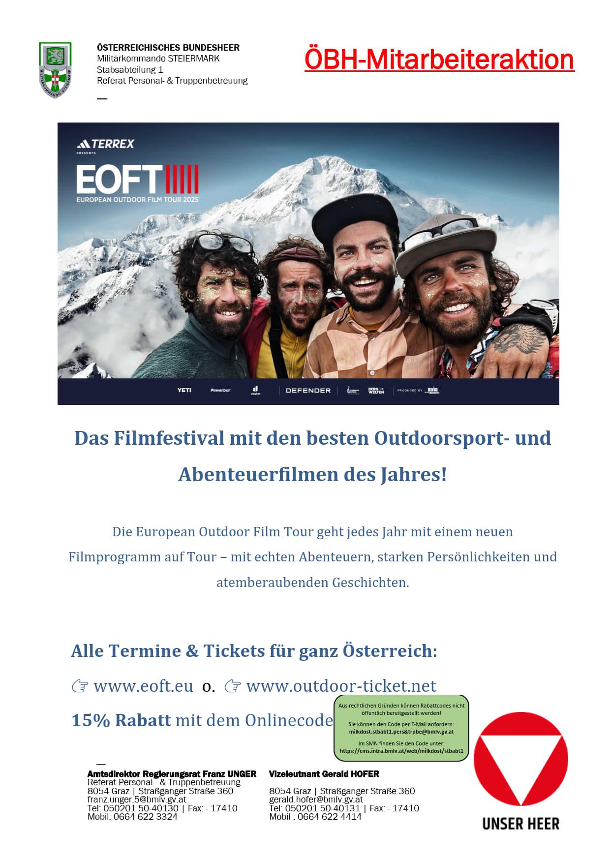 UND SO FUNKTIONIERT´s….Anmeldung ausdrucken, ausfüllen, unterschreiben und eine der folgende Email Adressen schicken : stefan.huemer.4@bmlv.gv.atDas Referat Truppen- und FamBetr/MilKdo OÖ bestätigt dan ...