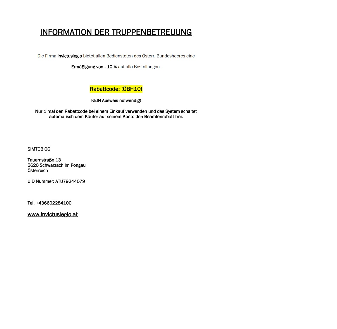 Die Firma invictuslegio bietet allen Bediensteten des Österr. Bundesheeres eine Ermäßigung von -10% auf alle Bestellungen.