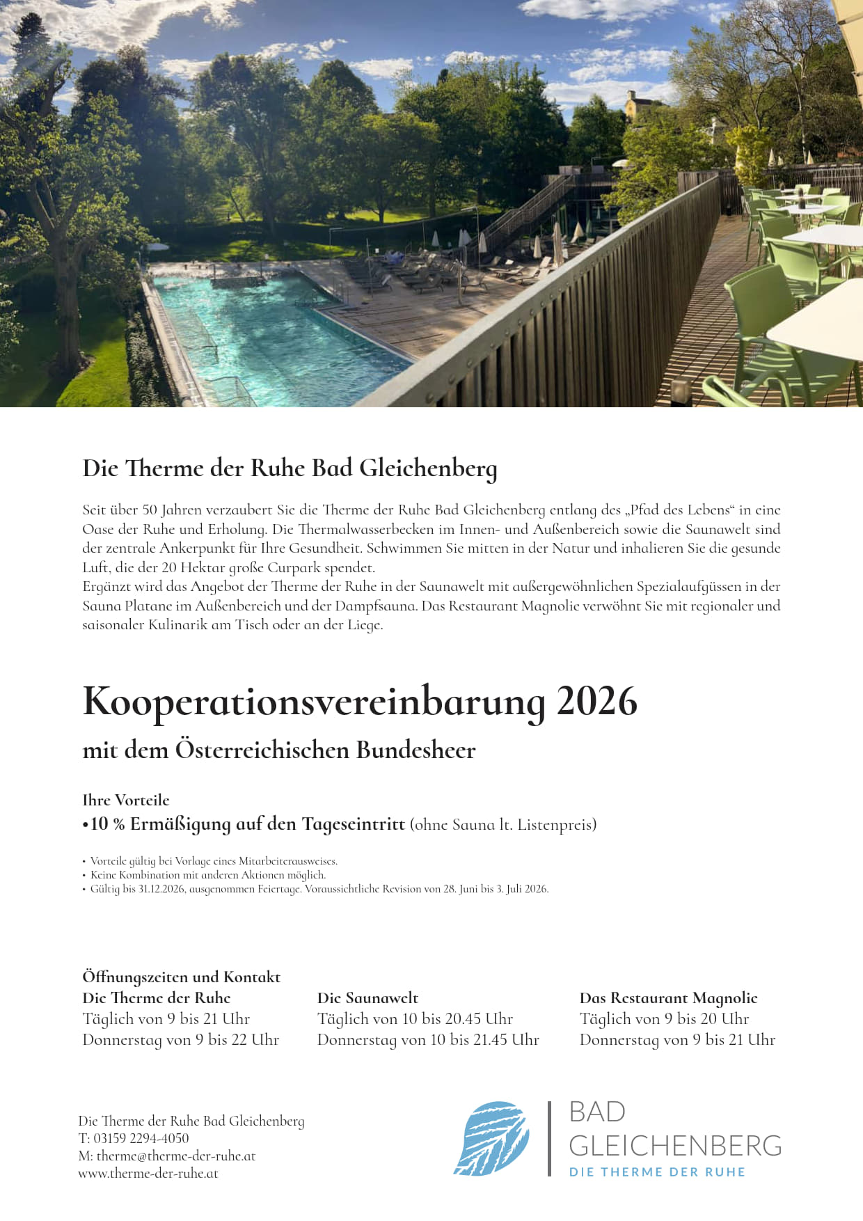 Therme der Ruhe; Bad Gleichenberg;10% Ermäßigung gegen Vorlage Wehr-/Dienstausweis