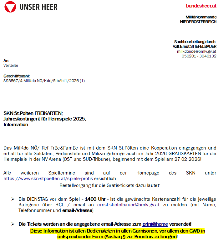 UND SO FUNKTIONIERT´s….Anmeldung ausdrucken, ausfüllen, unterschreiben und eine der folgende Email Adressen schicken : stefan.huemer.4@bmlv.gv.atDas Referat Truppen- und FamBetr/MilKdo OÖ bestätigt dan ...