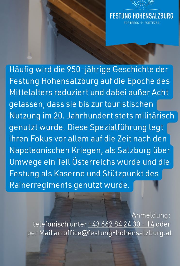 Die rund 950-jährige Geschichte der Festung wird oft auf das Mittelalter reduziert – dabei blieb sie bis ins 20. Jahrhundert ein militärisch genutzter Standort. Diese spannende Spezialführung legt den Fokus auf die Zeit nach den Napoleonischen Kriegen, als Salzburg Teil Österreichs wurde und die Festung als Kaserne sowie als Stützpunkt des Rainerregiments diente.